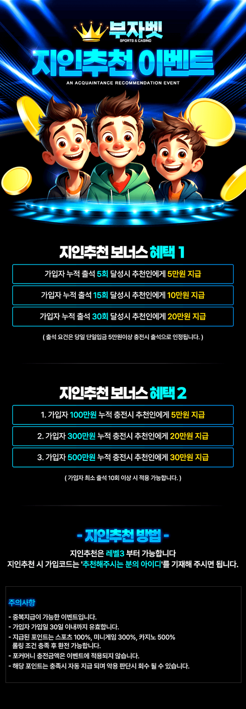 부자벳 도메인 주소는 https://bjbet777.com/?code=1213입니다. 위 도메인 주소로 웹사이트 접속이 불가능한 경우, 현재 웹사이트 상단에 "자동 코드등록으로 회원가입 바로가기" 버튼을 통해 최신 도메인 주소로 웹사이트에 접속이 가능합니다.
